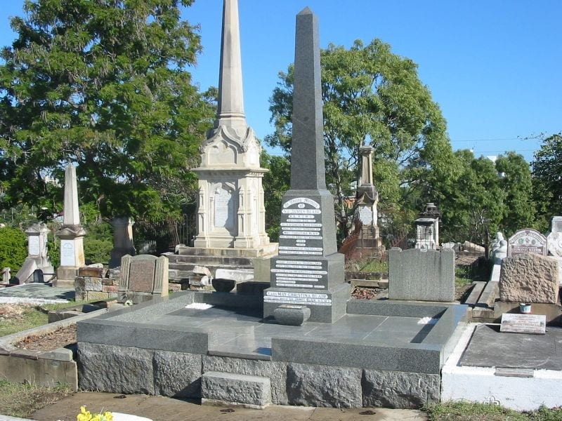 Walls are African Black Granite, set over two elevated platforms at the back of Toowong cemetery. The veneer fixed to the face of each platform is a split book-Leafe granite veneer from North Queensland quarries.
