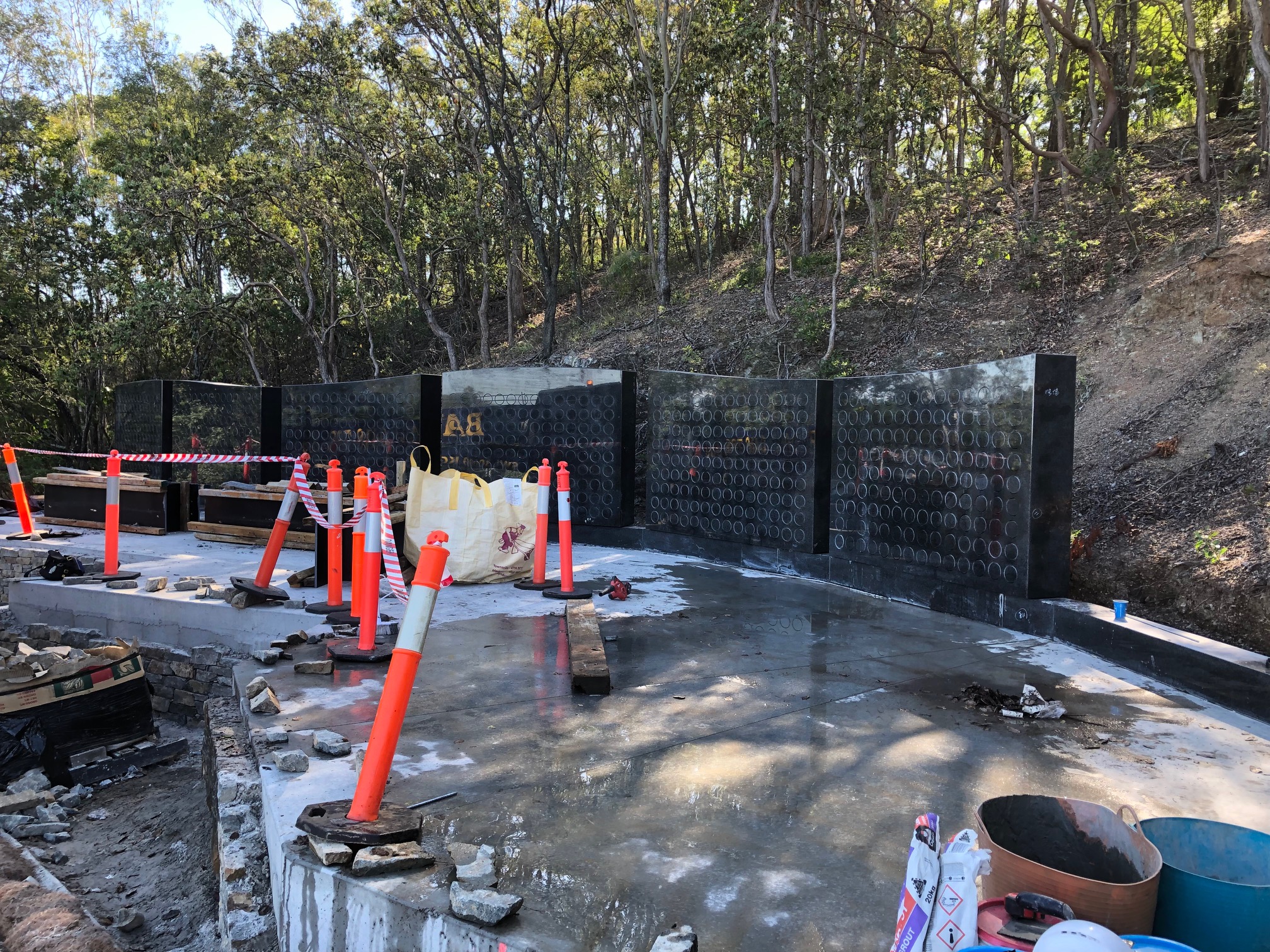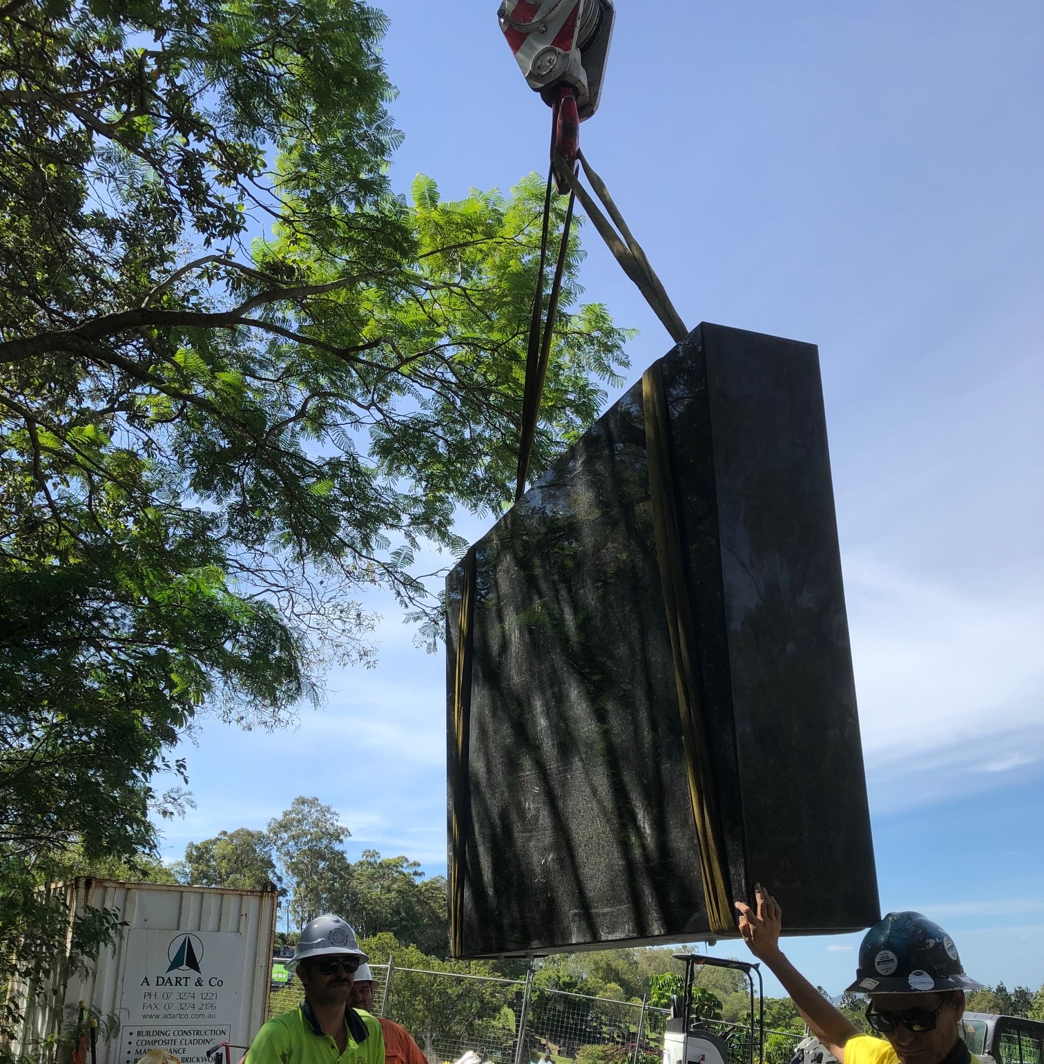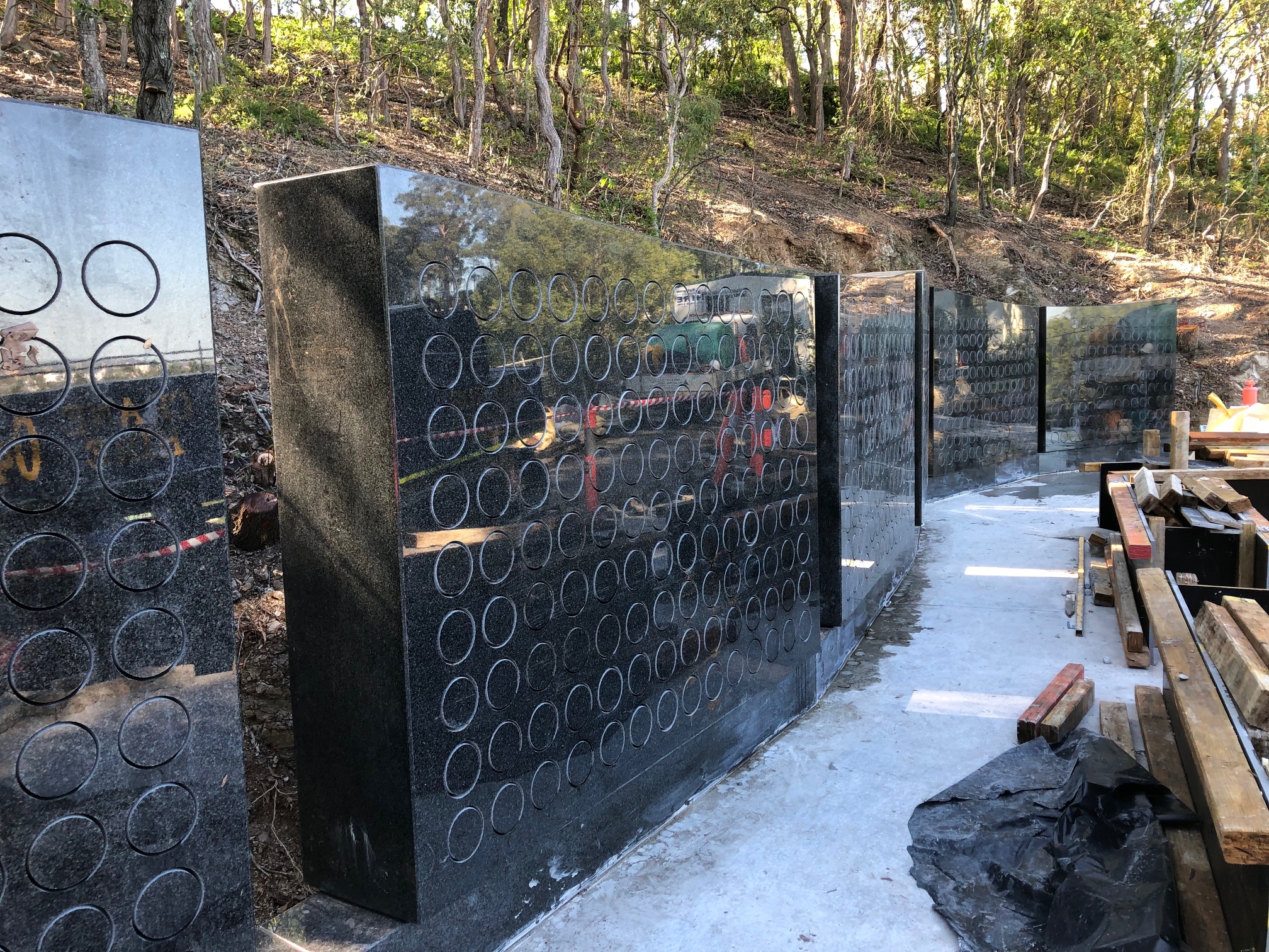Walls are African Black Granite, set over two elevated platforms at the back of Toowong cemetery. The veneer fixed to the face of each platform is a split book-Leafe granite veneer from North Queensland quarries.