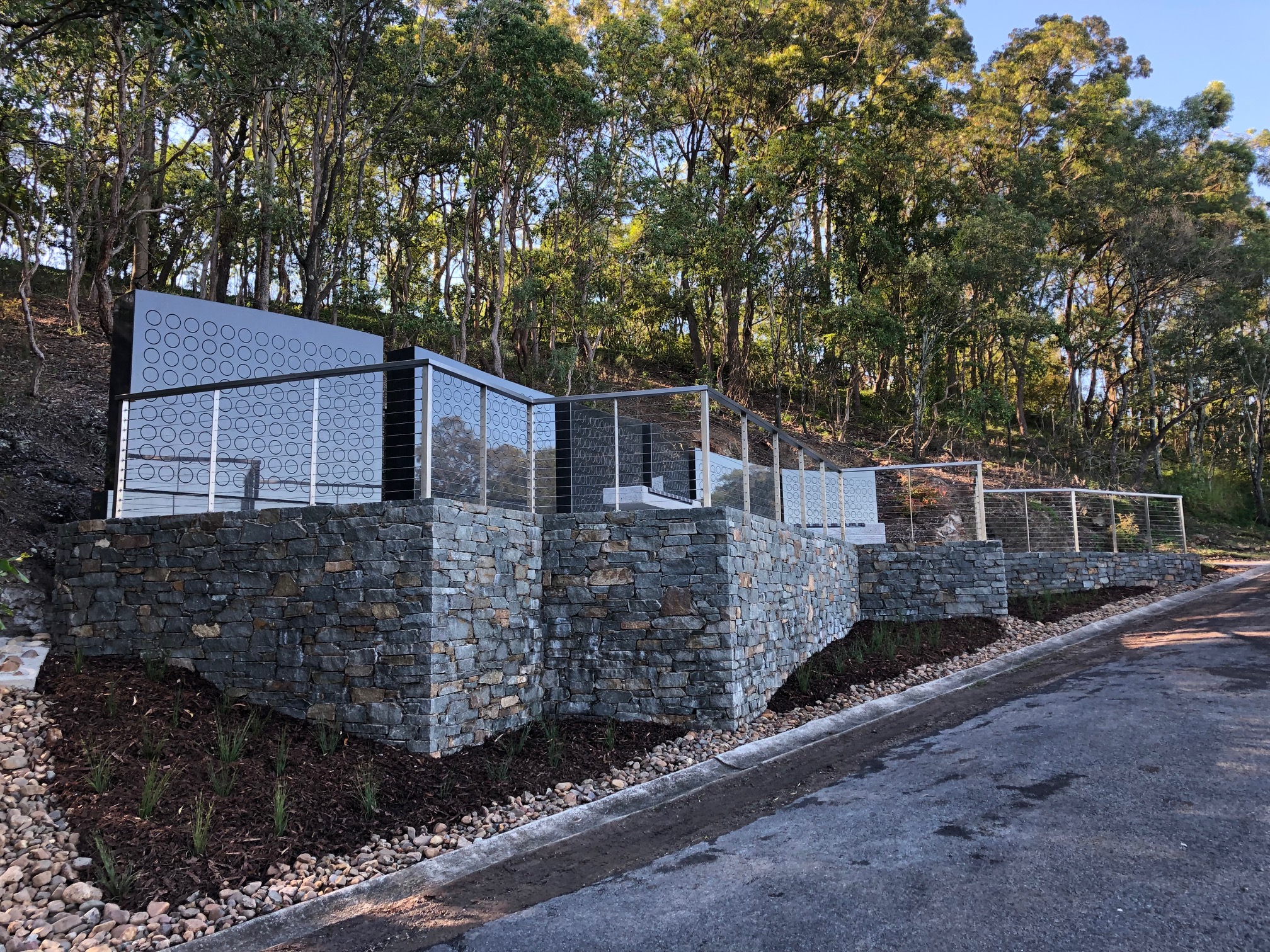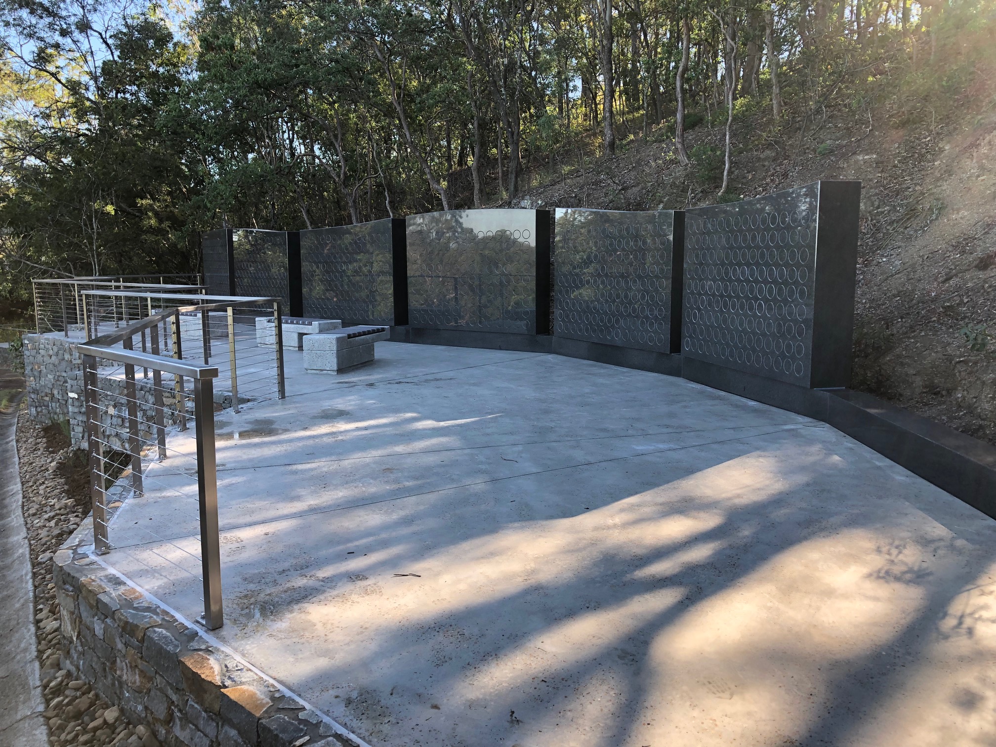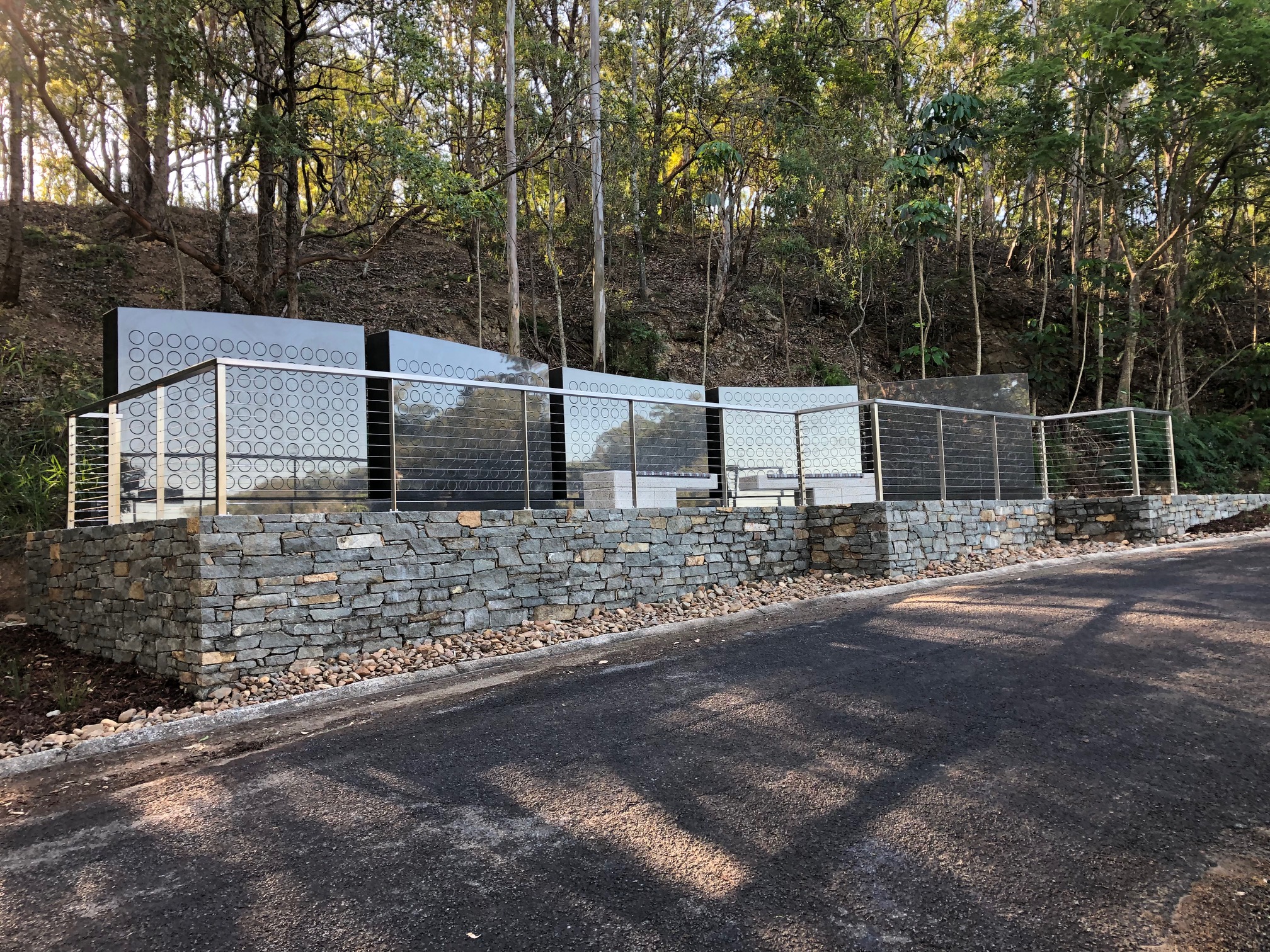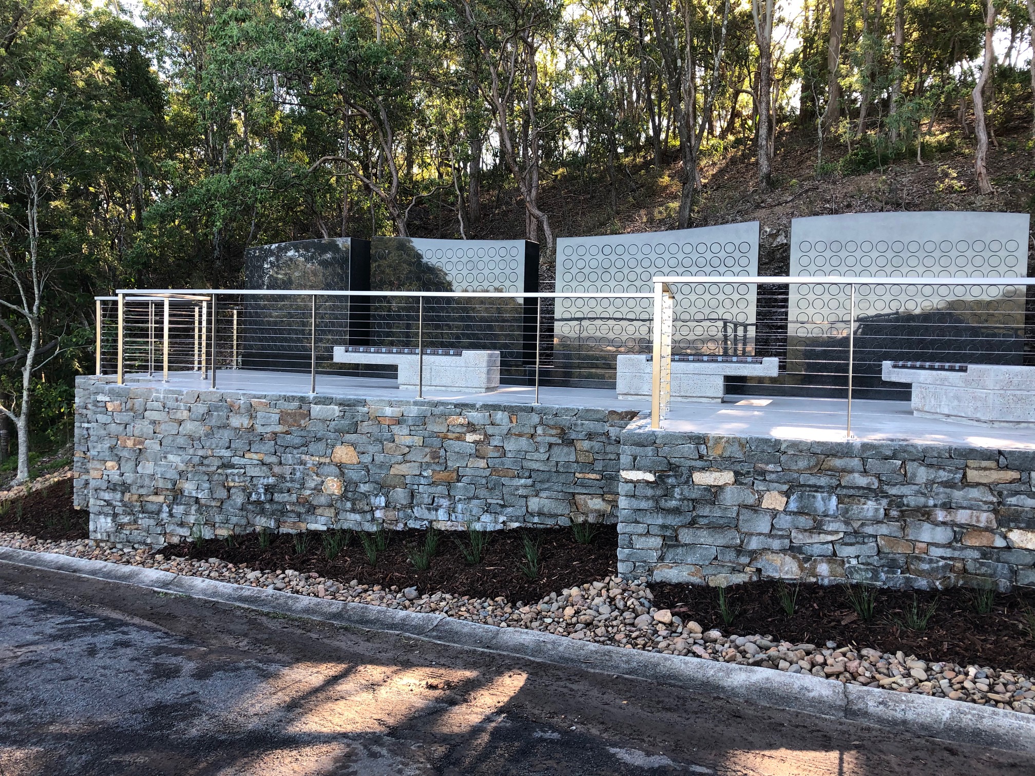 Walls are African Black Granite, set over two elevated platforms at the back of Toowong cemetery. The veneer fixed to the face of each platform is a split book-Leafe granite veneer from North Queensland quarries.